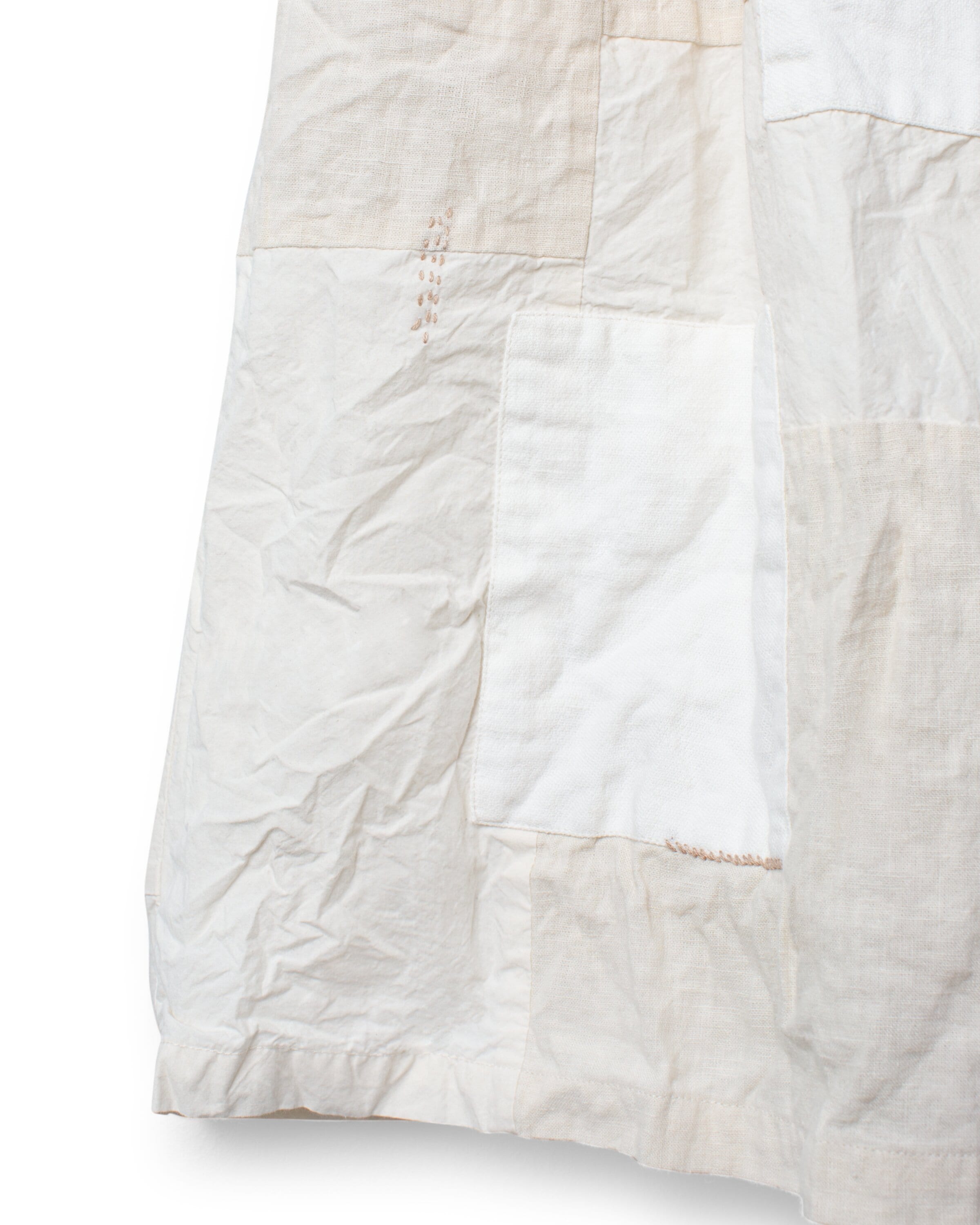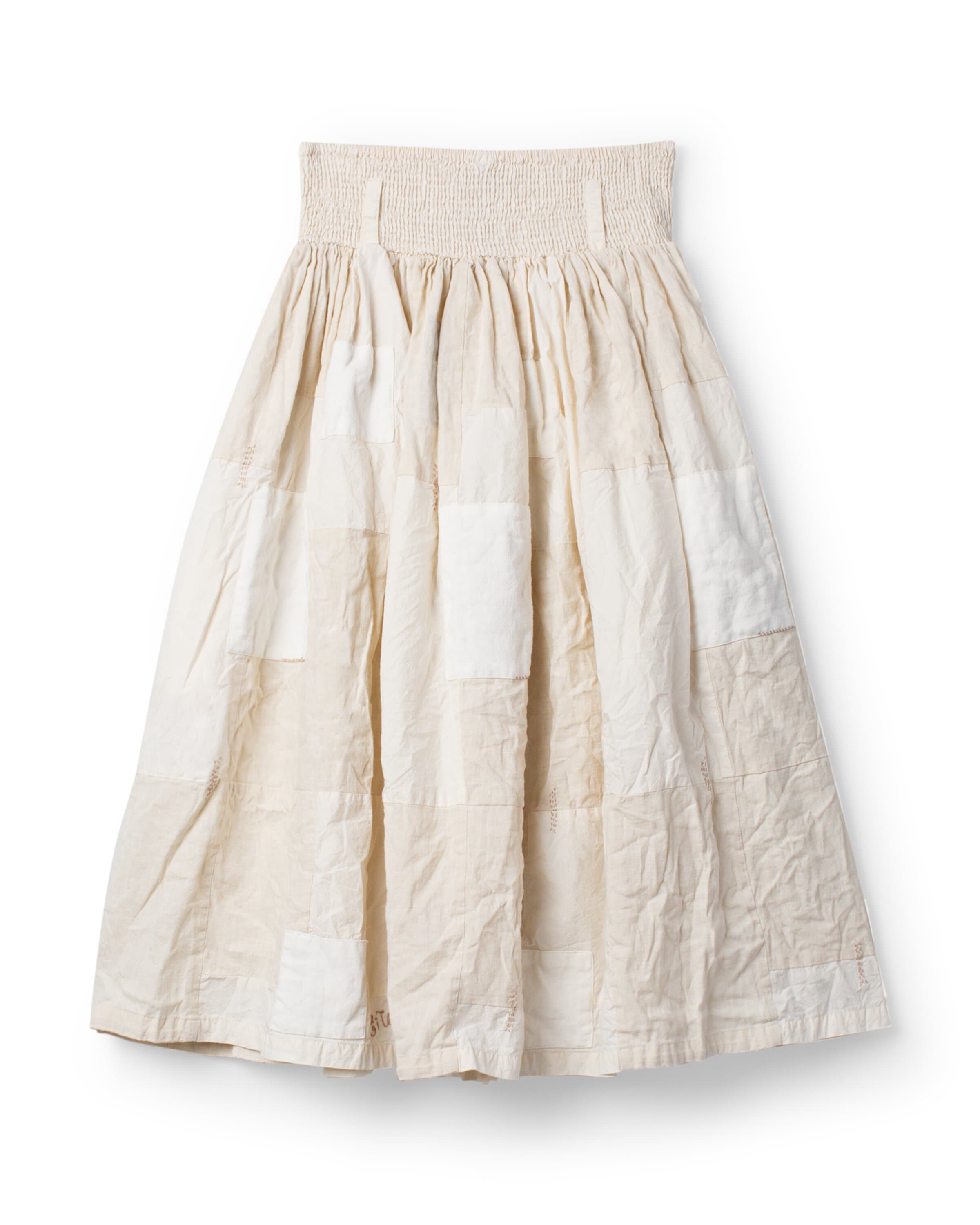Ankle-length skirt in patch in this season's lovely twill, linen and greige cotton, decorated with embroidered monogram, mending details and beautiful lace pocket on left side. Smock at the waist for a good fit, belt loops, wrinkled from the smock for a lovely volume and side seam pockets.