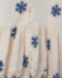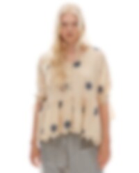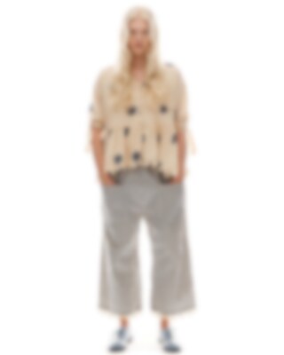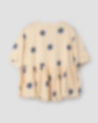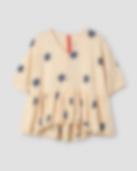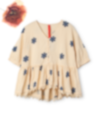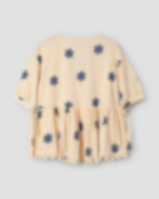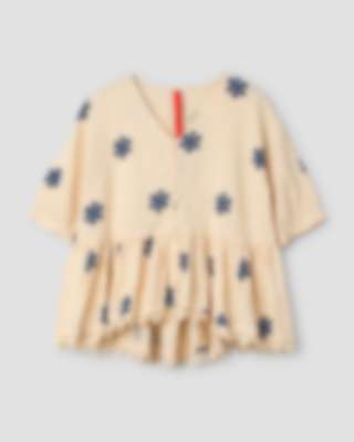 V-necked flower blouse in cotton, short sleeves with tie ribbons. Buttoning at the front, wrinkled from the waist with longer back piece and ending with beautiful lace.