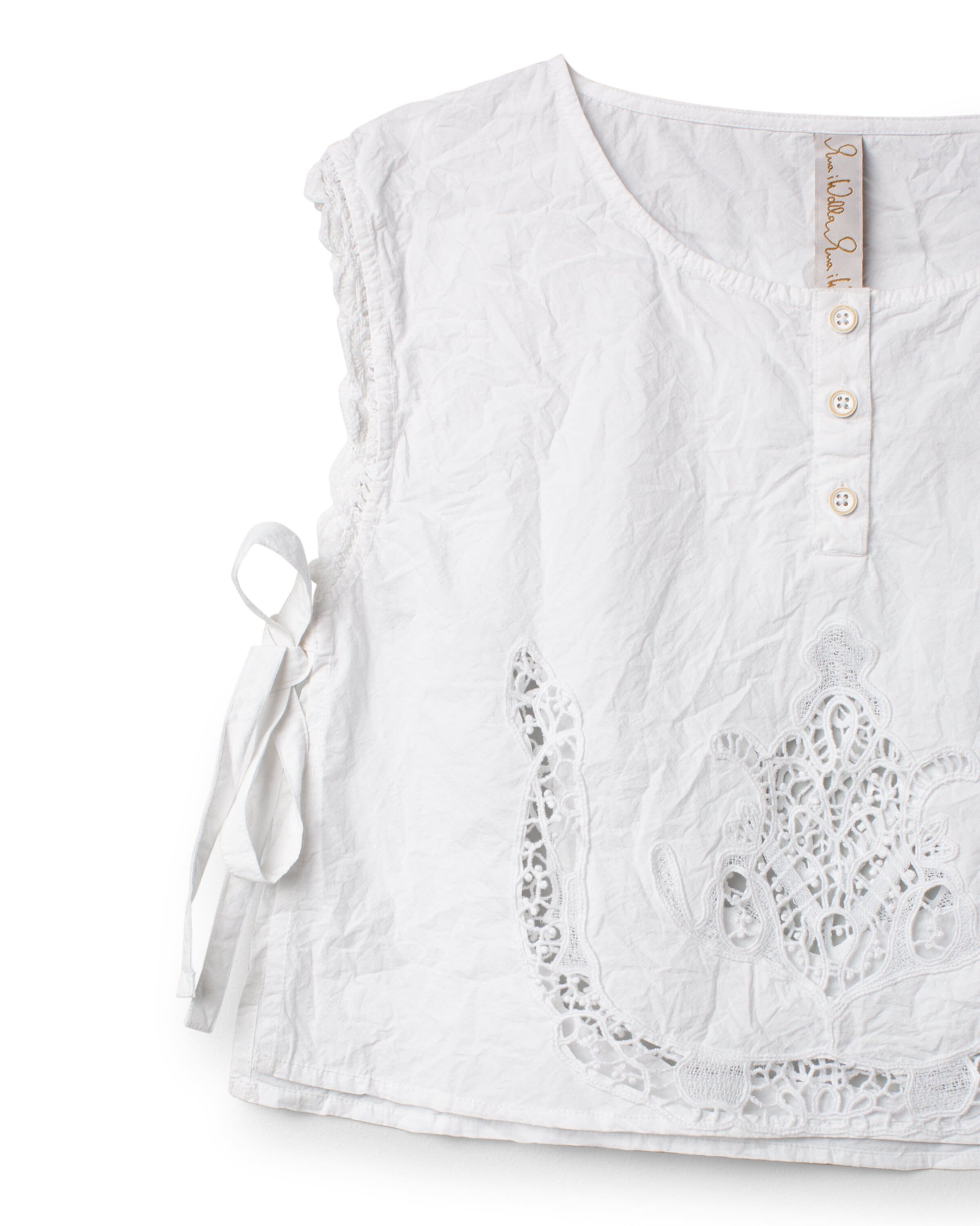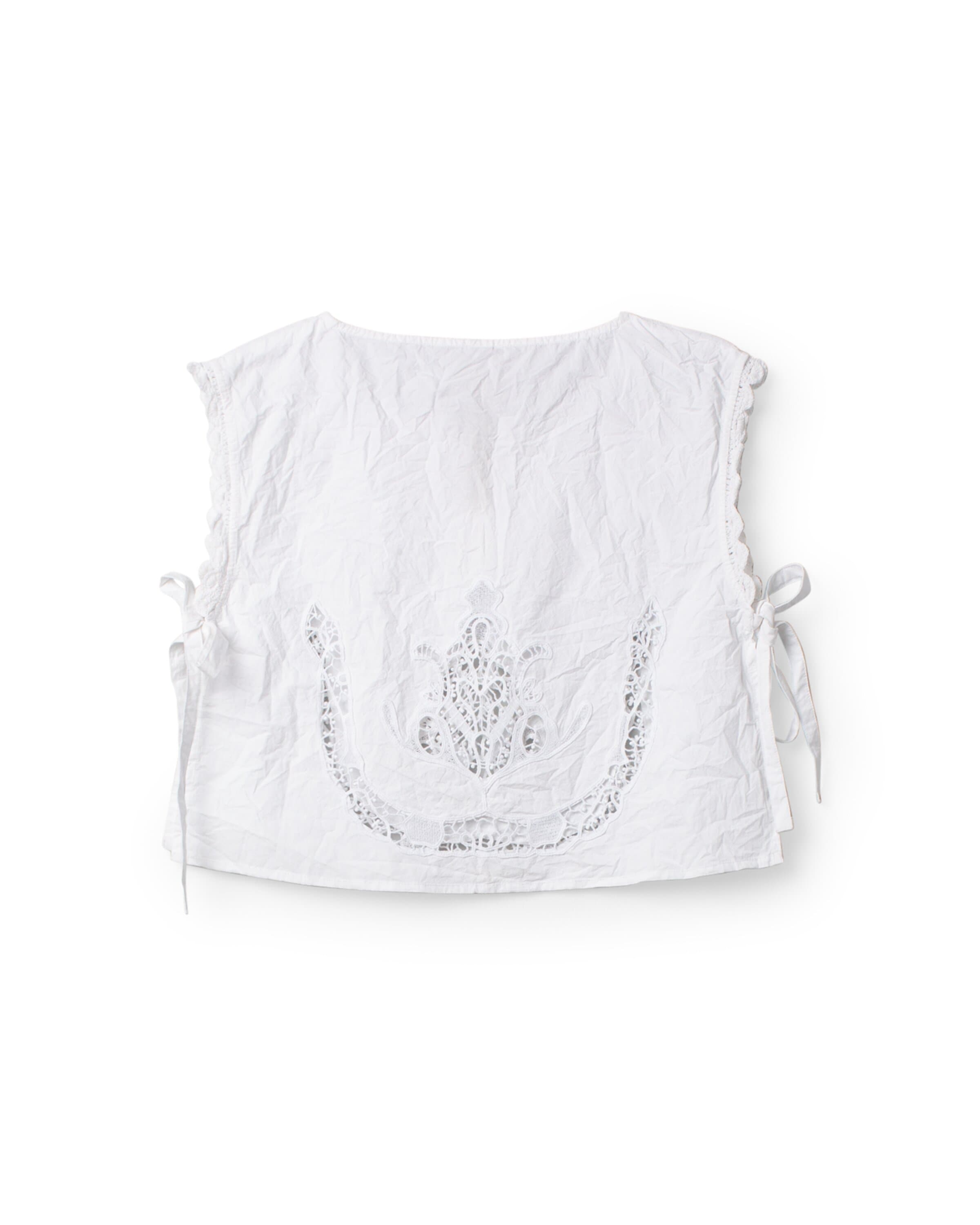 Vest in cotton with open sides and beautiful see through lace details at the bottom. Lace around armpit, tie ribbons in sides and front buttoning.