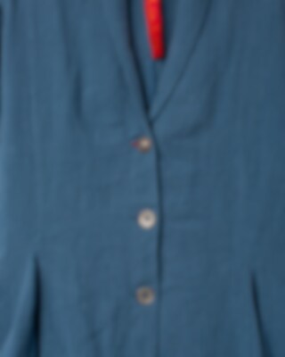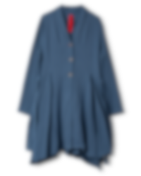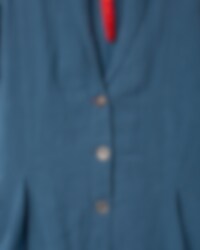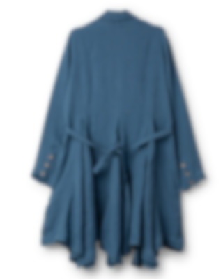 Coat in twill with shawl collar, tie ribbons and wedges from the waist for a beautiful silhouette. Front buttoning with different buttons and one buttonhole in a different colour for a playful effect, side seam pockets.