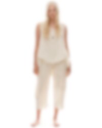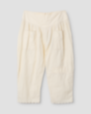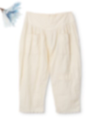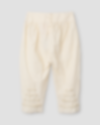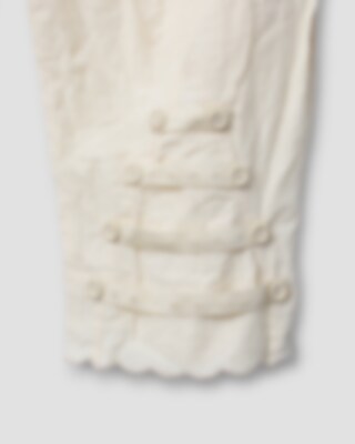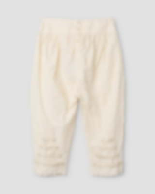 Trousers in cotton with buttoning at the back, pleated from the waistband and external pockets with beautiful scallop hem. Mending detail with cast stitch on left knee, adjustable elastic at the back of the calf and beautiful scallop hem.