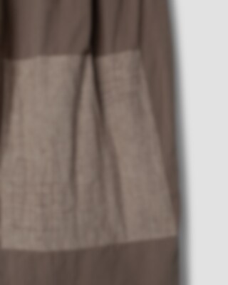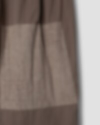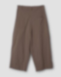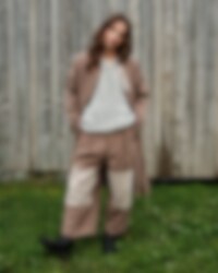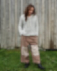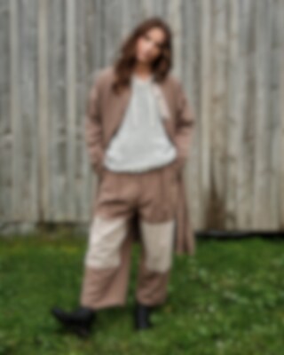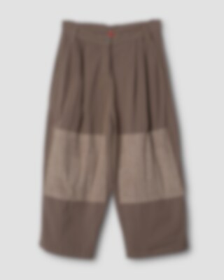 Trousers in twill with button fly and belt loops. Wide model with front pleats, side pockets and a jet pocket at the back, linen patches with sashiko stitches.