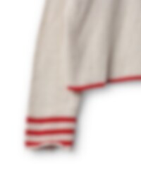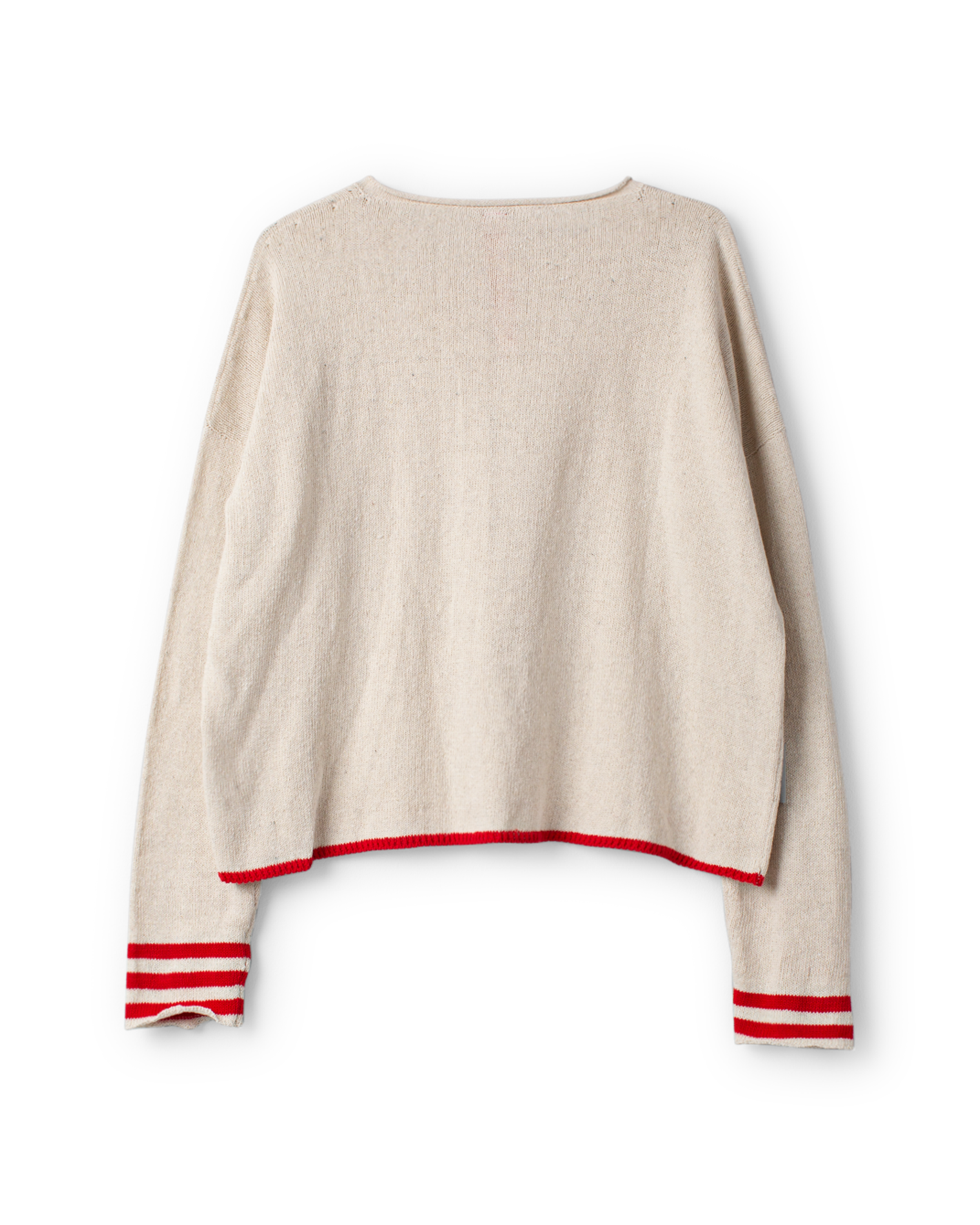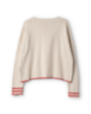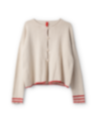 Cardigan in stockinette stich with stripes in a different colour at sleeves and at the rib knit bottom. Buttoning with crocheted loops and buttons front, loops in the same colour as the stripes for a playful effect.