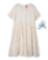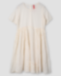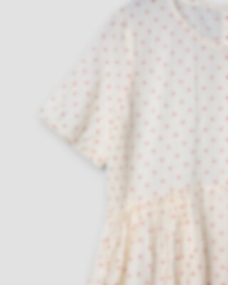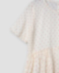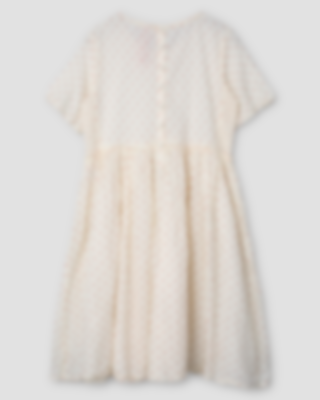 Knee-length dress in dot voile, short sleeves with elastic hem. Buttoning at the back with covered buttons, smock at the sides and wrinkled from the waist for lovely volume.