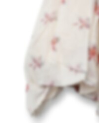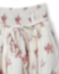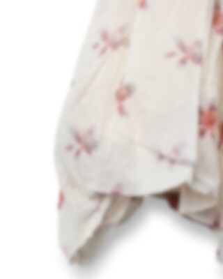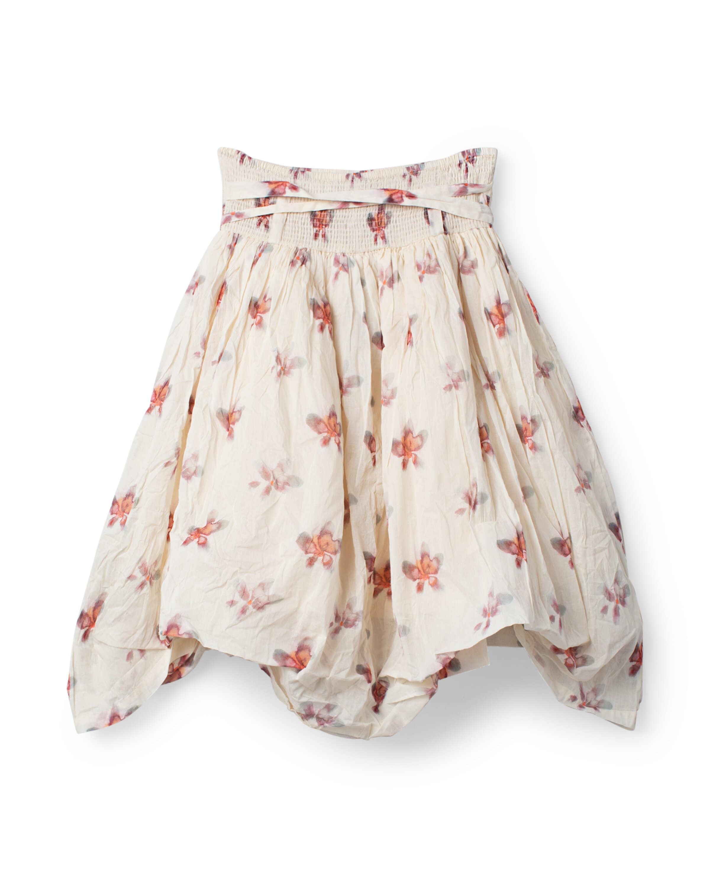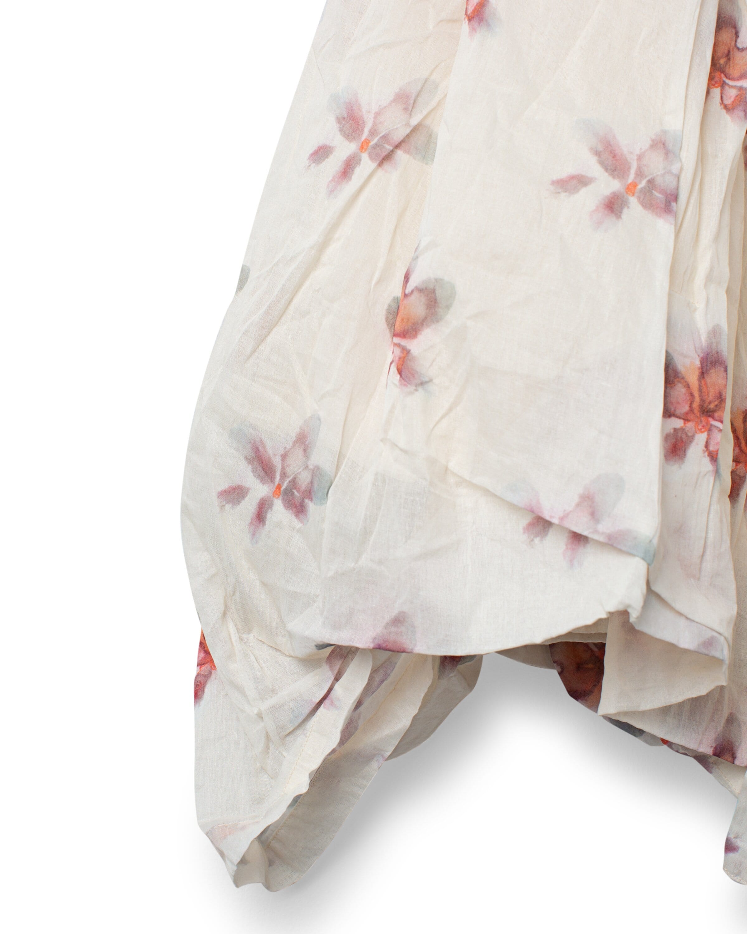 Calf-length skirt in sheer flower organdie with partually pinched up hem for a playful effect. Belt loops, tie ribbons and smock at the waist for a good fit. Wrinkled from the smock for a lovely volume and a shorter underskirt in solid organdie.