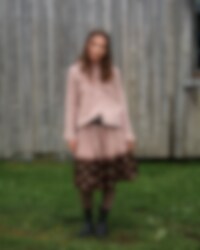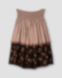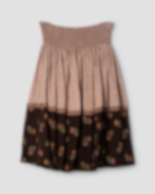 Knee-length floral skirt in linen with smock at the waist for a good fit. Lovely mix of solid coloured linen and linen flower with decorative velvet ribbon.