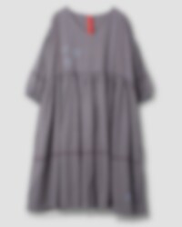 V-neck calf-length dress in linen, 3/4 sleeves with inserted lace and elastic hem. Beautiful lace details and block prints, wrinkled from the waist for lovely volume and pockets in side seam.