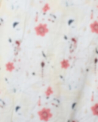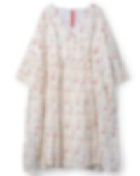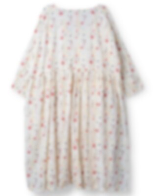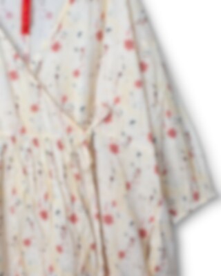 Calf-length wrap-around dress in flower cotton voile with tie ribbons. Long sleeves with elastic hem, wrinkled skirt back and on top layer front for a lovely volume and side seam pockets.
