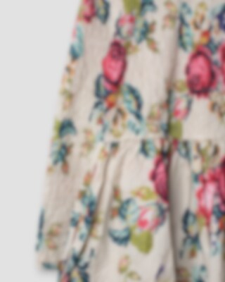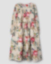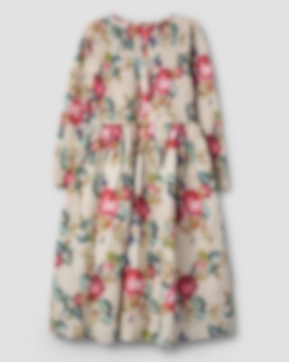 Calf-length dress in organic flower cotton with smocked bodice and sleeves. Wrinkled from the waist for lovely volume, buttoning at the back and side seam pockets.