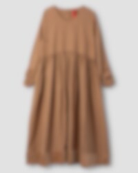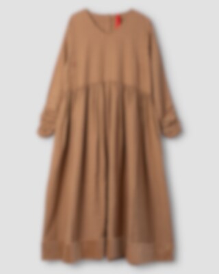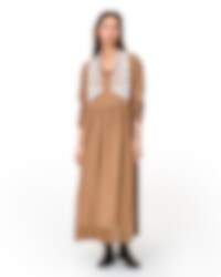 Calf-length, V-necked dress in checked linen, long sleeves with elastic. Beautiful handmade embroideries, buttoning at the back and wrinkled from the waist for lovely volume. Adjustable skirt with tie ribbons and velvet ending, side seam pockets.
