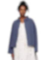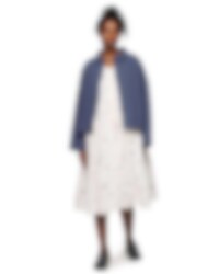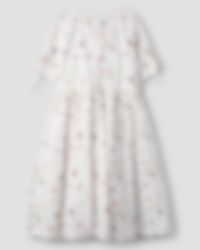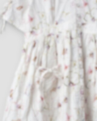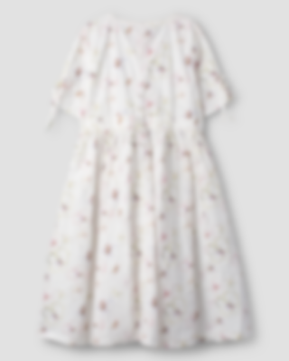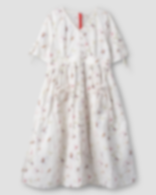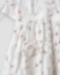 Calf-length, floral cotton dress, short sleeves with decorative lacing. Crocheted lace at the neckline, buttoning front and back, wrinkled from the waist for lovely volume and external pockets with drawstring.