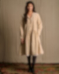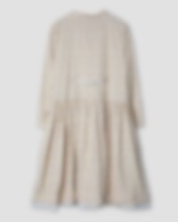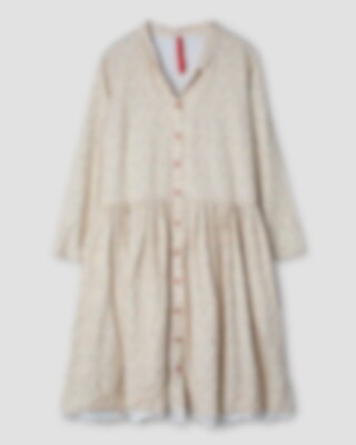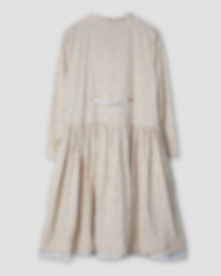 Calf-length floral dress in cotton with long sleeves and lapel collar. Buttoning at the front, adjustable elastic band at the back, wrinkled from the hip for lovely volume and pockets in side seam.