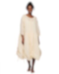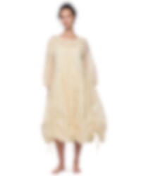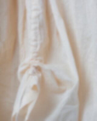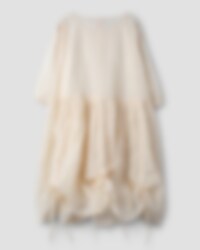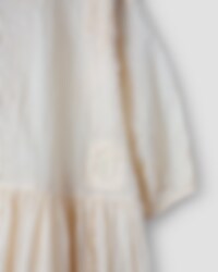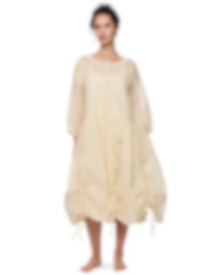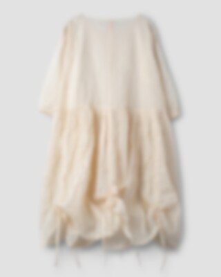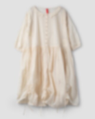Calf-length dress in sheer organdie, three-quarter sleeves with elastic hem. Beautiful lace collar, decorative embroideries, inserted lace and pin-tucks. Buttoning at the front, wrinkled from the hip for lovely volume and drawstring details on the skirt. Please note that this dress is transparent and we are using a dress under.
