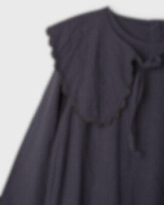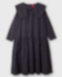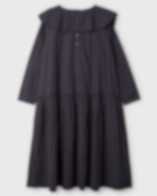 Calf-length, long-sleeved dress in cotton, detachable collar with tie ribbons and crocheted lace. Buttoning at the back, wrinkled from the hip for lovely volume, pockets at the front and decorated with zig-zag ribbon.