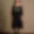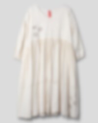 V-neck calf-length dress in linen, 3/4 sleeves with inserted lace and elastic hem. Beautiful lace details and block prints, wrinkled from the waist for lovely volume and pockets in side seam.