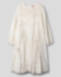 Calf-lenght dress in linen with crocheted top, long sleeves with elastic hem. Buttoning at the back, wrinkled skirt for lovely volume with beautiful prints and embroidered details.