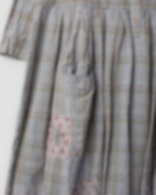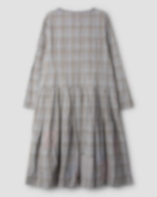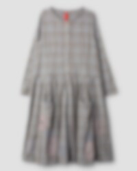 Calf-length dress in checked cotton with patches, decorative seams and long sleeves. Crocheted lace at the neckline, buttoning and jetted pockets at the front, pleated from the hip for lovely volume.