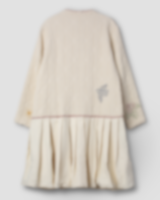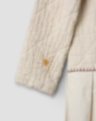 Coat in quilted cotton with beautiful handmade embroideries and blanket stitching. Buttoning with button and loop, jetted pockets at the front and pleated skirt in double layers of cotton.