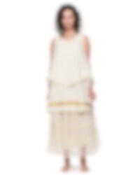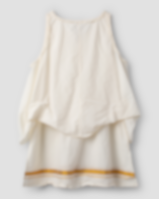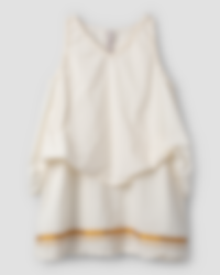 V-necked, sleeveless cotton tunic with gold stripe. Round cut upper layer with partially pinched hem and ruffle around the neckline and armholes, longer underlayer with vents in side.