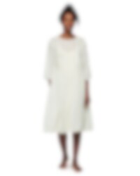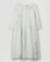 Knee-length dress in sheer organdie with beautiful flower applications and lace. Three-quarter sleeves, buttoning with crocheted buttons at the back and wrinkled from the waist for lovely volume. Please note that this dress is transparent and we are using a dress under.