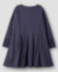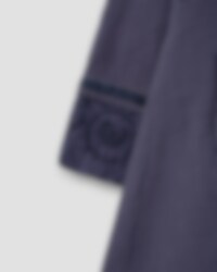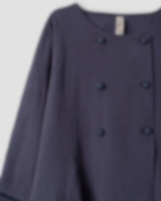 Coat in structured cotton with velvet ribbon and embroidered cotton voile at bottom sleeve. Buttoning with crocheted buttons and welt pockets at the front, box pleats from the waist back for lovely volume.