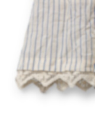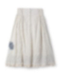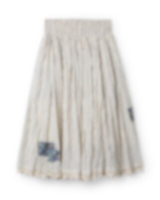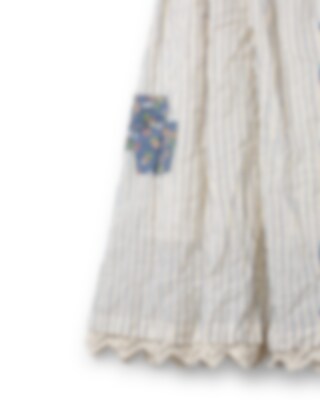 Ankle-length skirt in striped cotton voile, decorated with patches in floral twill and lace at hem. Partially smocked at the waist for a good fit, belt loops and button fly front. Wrinkled from the smock for a lovely volume, side seem pockets and solid underskirt.