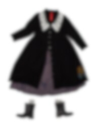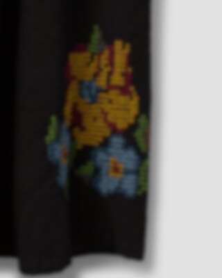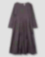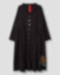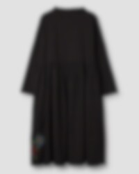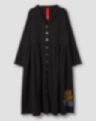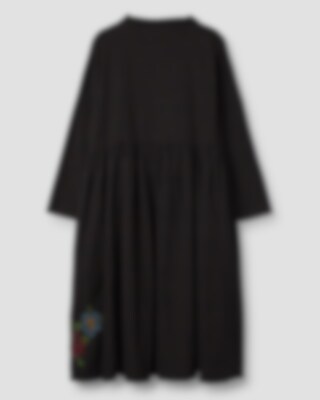 Calf-length, long-sleeved dress in cotton-wool with beautiful cross stitch embroidery. Lapel collar, buttoning at front and wrinkled skirt for lovely volume, side seam pockets.