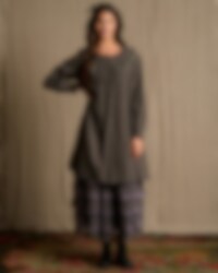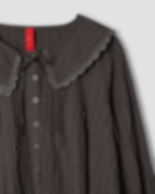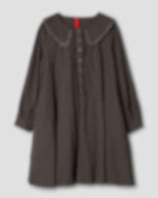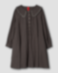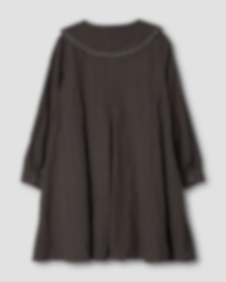 A-shaped tunic in checked cotton with shirt sleeves. Detachable collar with tie ribbons and beautiful crocheted lace. Pin tucks, buttoning at the front and pockets in side seams.