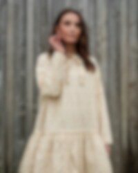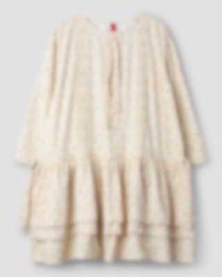 Long-sleeved flower tunic in cotton in a wide model. Beautiful lace on the shoulders, decorative tie ribbons at the neckline and pin-tucks at the front. Drawstring at the hip and three wrinkled flounces for lovely volume.