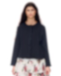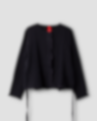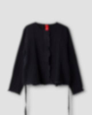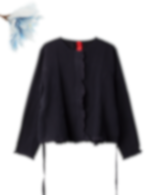 Jacket in twill in a slightly fitted model with tie ribbons at the waist. Wrinkled flounces, hidden buttoning at front, gores from the waist at the back and sashiko stitching on left sleeve.