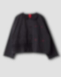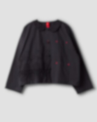 Loose fitted jacket in cotton with crocheted collar. Buttoning at the front with crocheted buttons, external pockets with embroidered details, ending with beautiful embroidery and inserted lace.