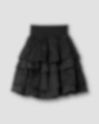 Kort volangkjol i en härlig mix av säsongens organdi med broderi och lappar. Smock i midjan för en bra passform, hällor för bälte och rynkad från smocken för en härlig volym.