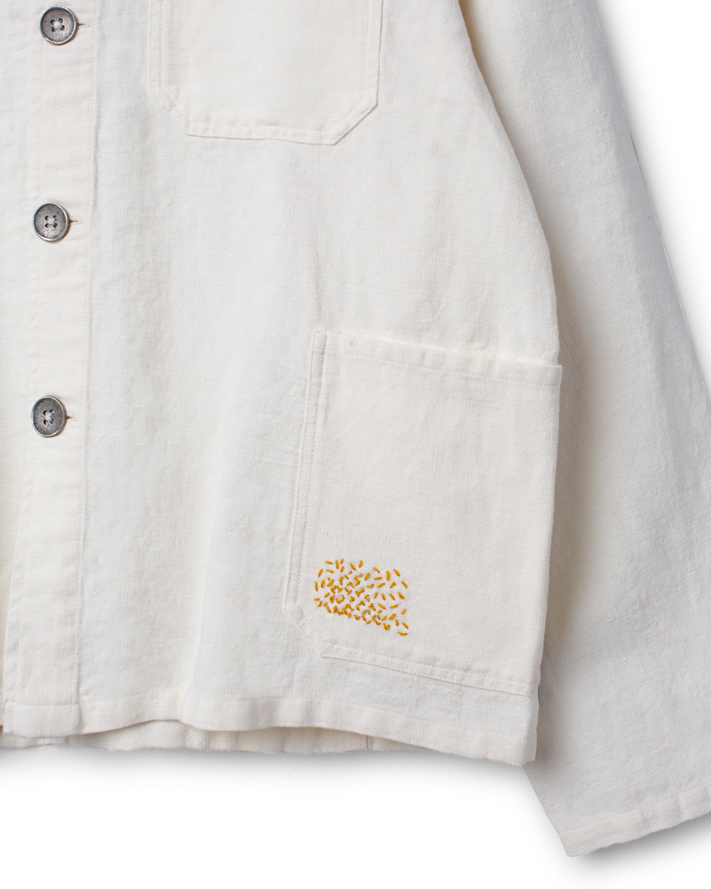 Herrjacka i workwear-inspirerad modell med krage. Bröstficka på vänster sida och utanpåliggande fickor fram, den vänstra med lagningsdetalj. Knäppning fram med ett knapphål i avvikande färg för en lekfull effekt.