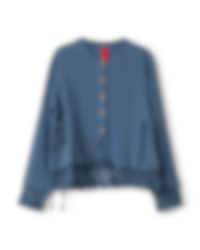 Jacka i twill med vackra spetsar på ärmavslut och i nederkant och snörning i sidorna för en vacker silhuette. Knäppning fram med olika knappar och två knapphål i avvikande färg för en lekfull effekt.