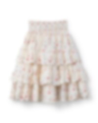 Knälång kjol i blommig bomullsvoile med flera volanger fastsydd på enfärgad underkjol. Smock i modja för en bra passform, hällor för bälte och rynkad från smock för en härlig volym.