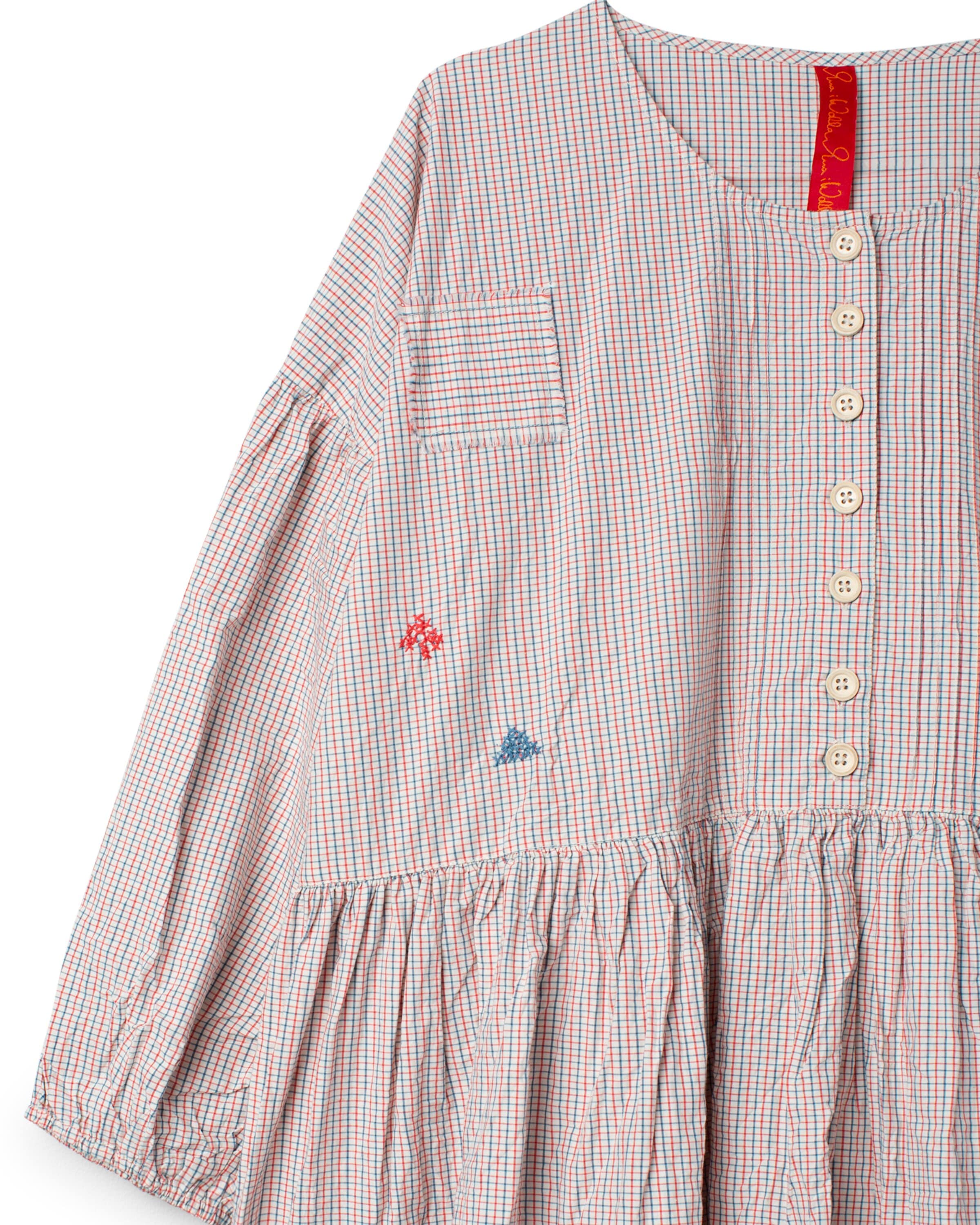 Vid tunika i rutig bomull med korsstygnsbroderier, lappar och stråveck fram. Trekvartsärm med resår i fåll, rynkad kjol med veck och spetskant nedtill.