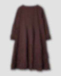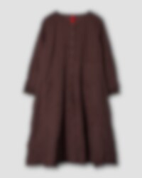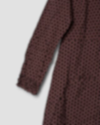 Vadlång klänning i småprickig bomull med lång ärm och dekorativ smock runt ärmsslut. Sashiko stygn runt halsringingen, knäppning fram, klockad kjol och passpoalfickor fram.