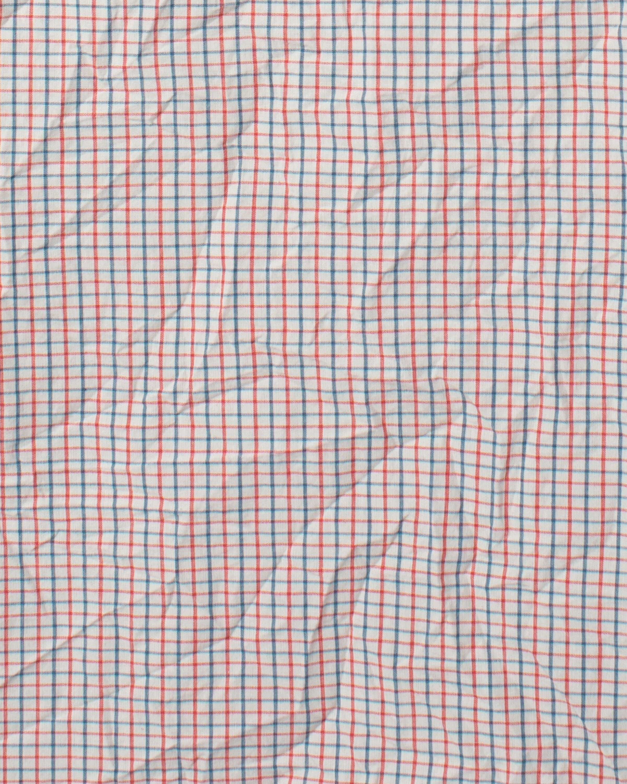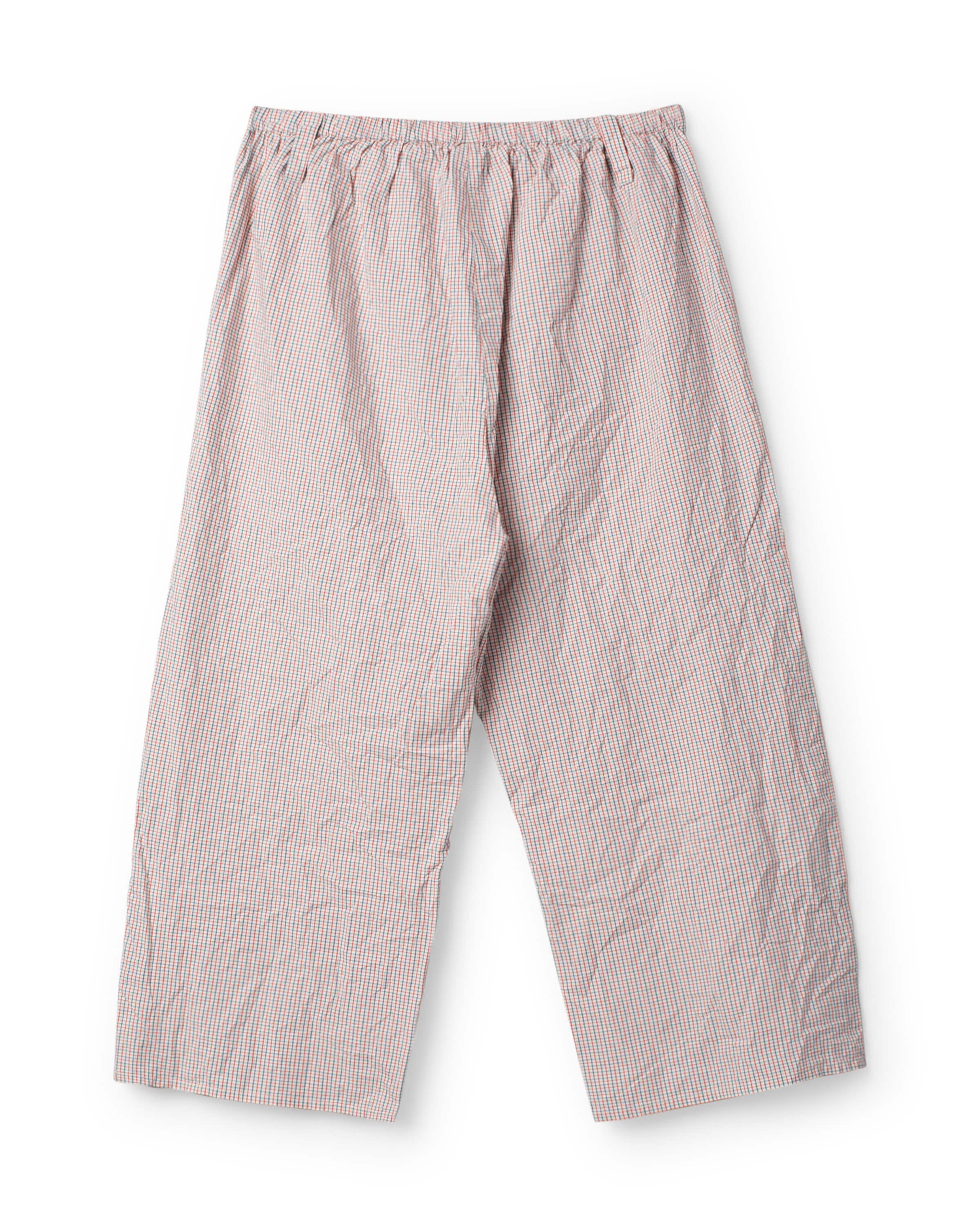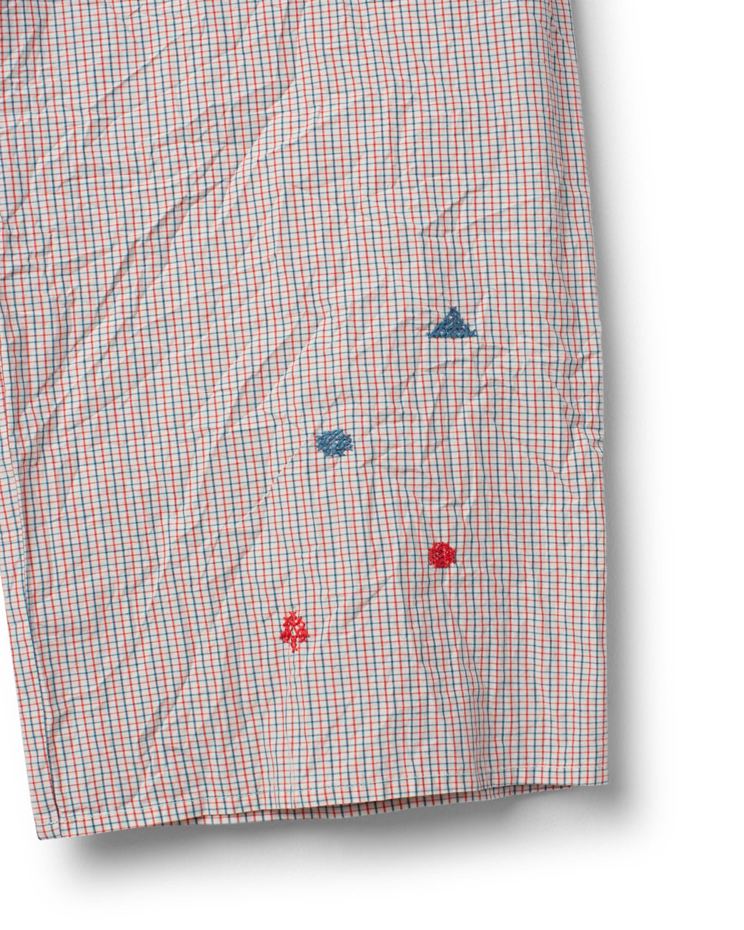 Byxa i rutig bomull med korsstygnsbroderier nedtill på vänster ben. Resår i midjan för en bra passform, hällor för bälte och utanpåliggande fickor fram.
