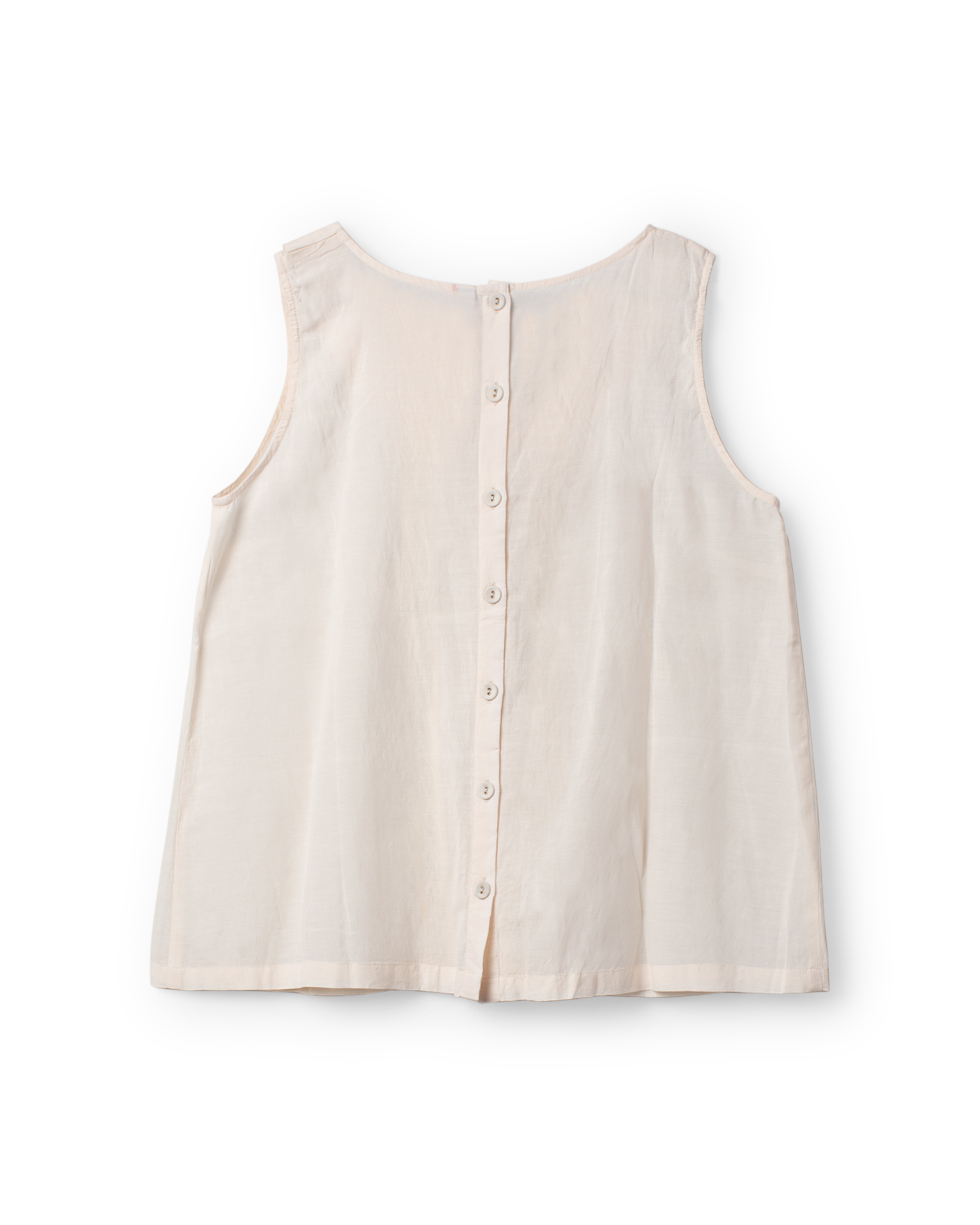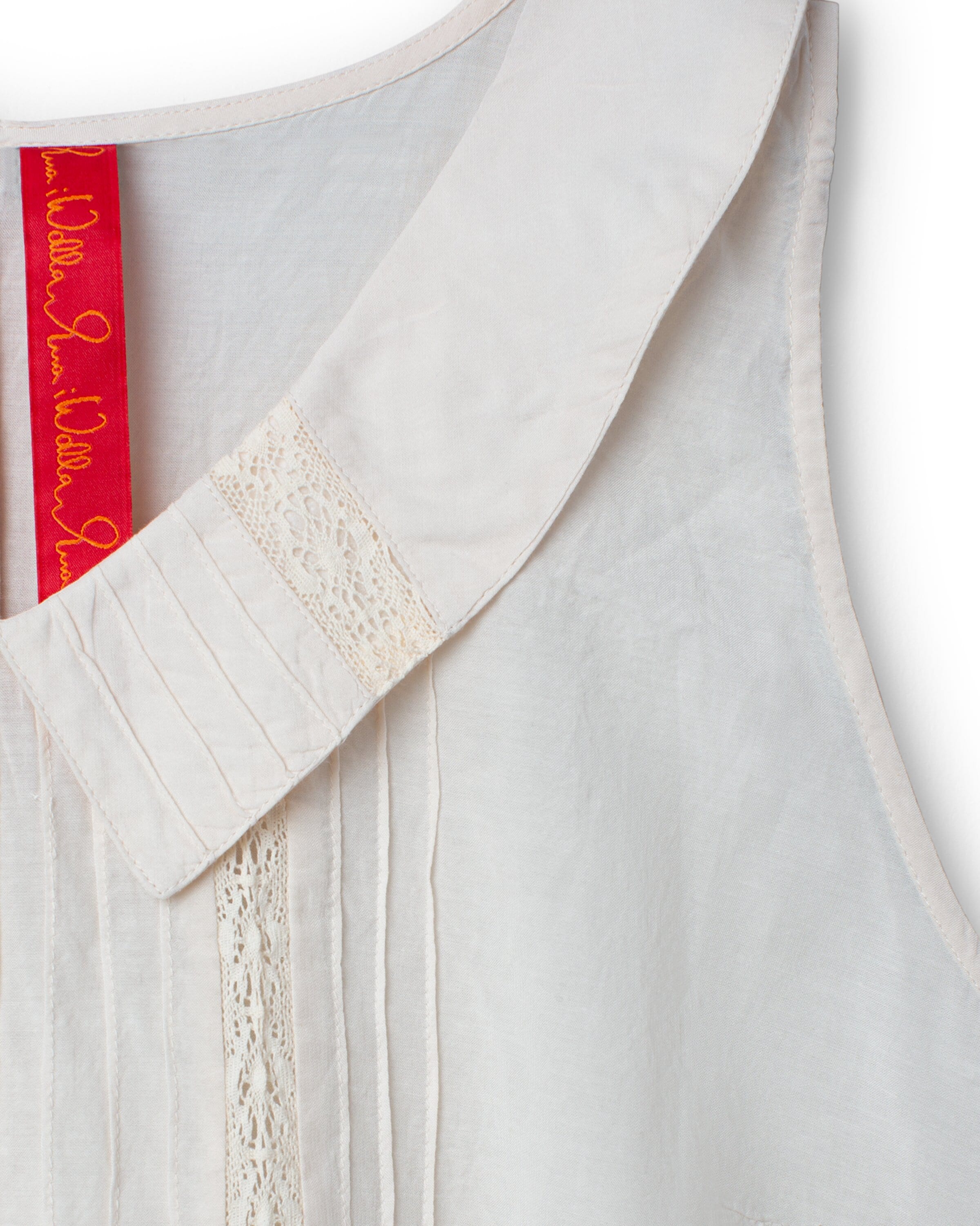 V-ringad topp i viskos- och bomullsvoile, dekorerad med stråveck och infällda spetsar fram och på kragen, knäppning bak.