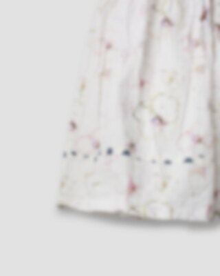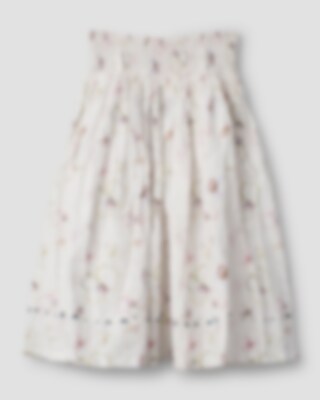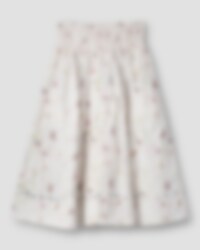 Ankellång, blommig bomullskjol med smock i midjan, hällor för bälte, dekorativa knappar och passpoalfickor. Rynkad från smocken för härlig volym, prickig bomullsdetalj i nederkant.