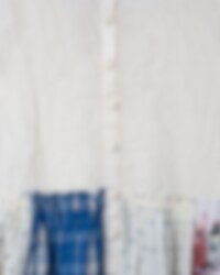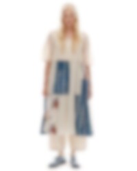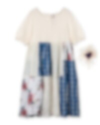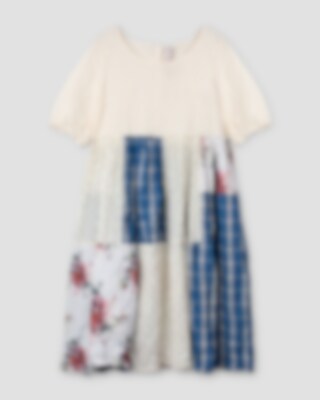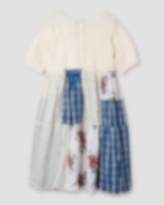 Vadlång klänning i en härlig mix av prickigt, rutigt och blommigt, kort ärm med resåravslut. Rynkad från midjan för härlig volym, knäppning bak med virkade knappar.