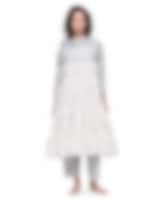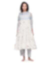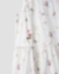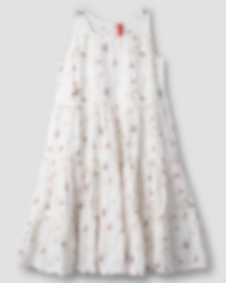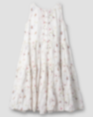 Ärmlös, vadlång blommig bomullsklänning med knäppning bak. Dekorerad med vacker broderad blomma, rynkad från midjan med flera volanger för härlig volym och fickor i sidsöm.