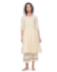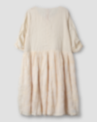Knälång klänning i lin och broderad bomullsvoile, kort ärm med resår. Vacker spetskrage, knäppning med virkade knappar och stråveck, rynkad kjol i dubbla lager för härlig volym, fickor i sidsöm.