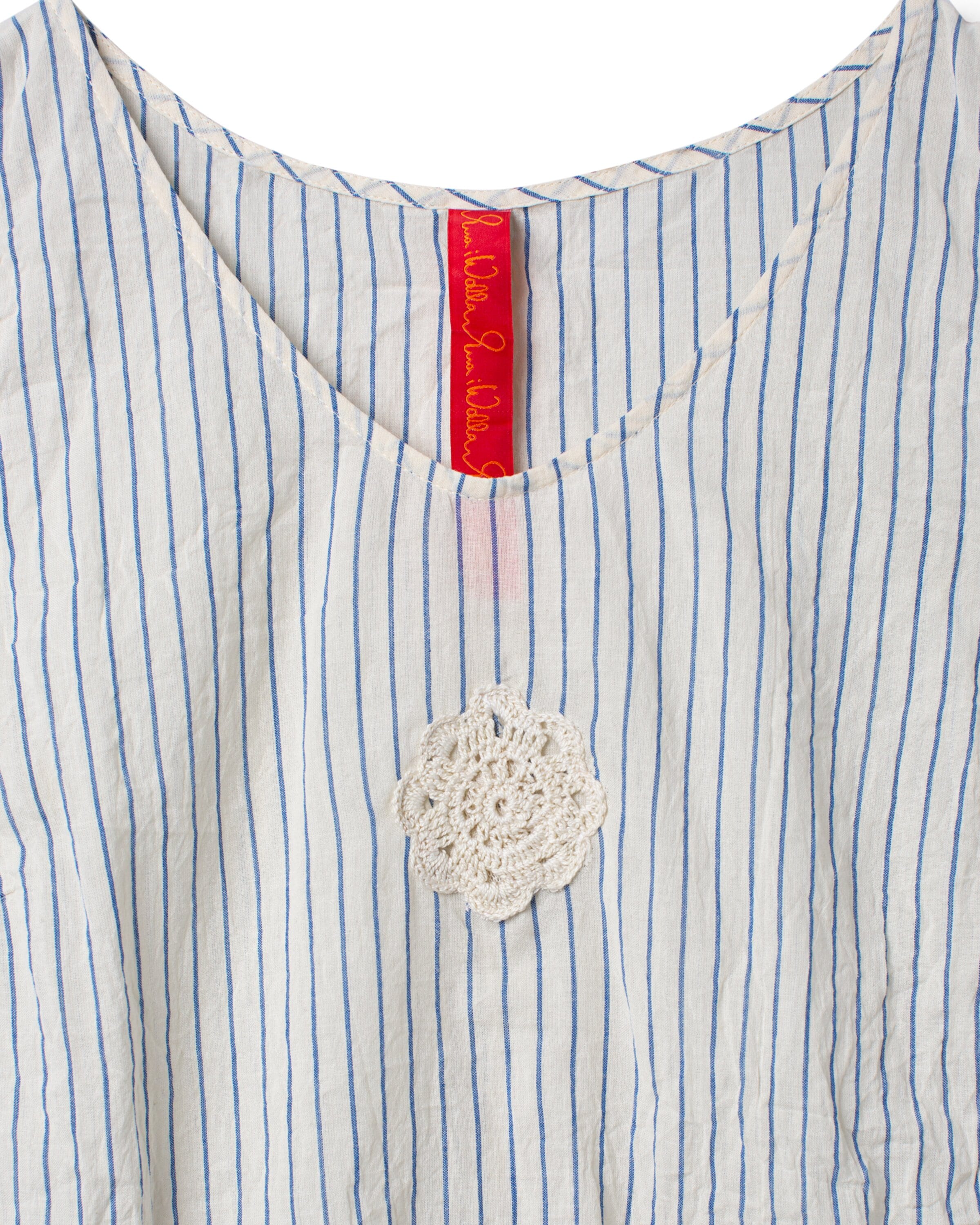 V-ringad topp i mönstrad bomullsvoile dekorerad med en virkad blomma mitt fram.