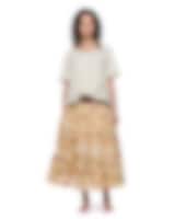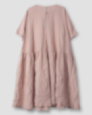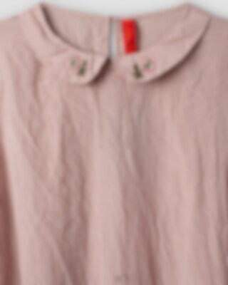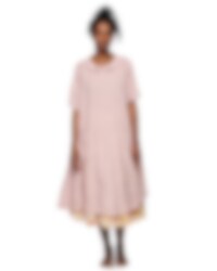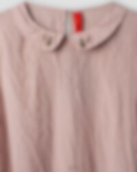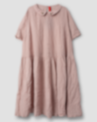 Vadlång klänning i viskos- och bomullsvoile, krage med broderade blommor. Kort ärm med sprund och klädda knappar, hålsöm och dekorativa knappar fram, rynkad från höften för härlig volym och fickor i sidsöm.