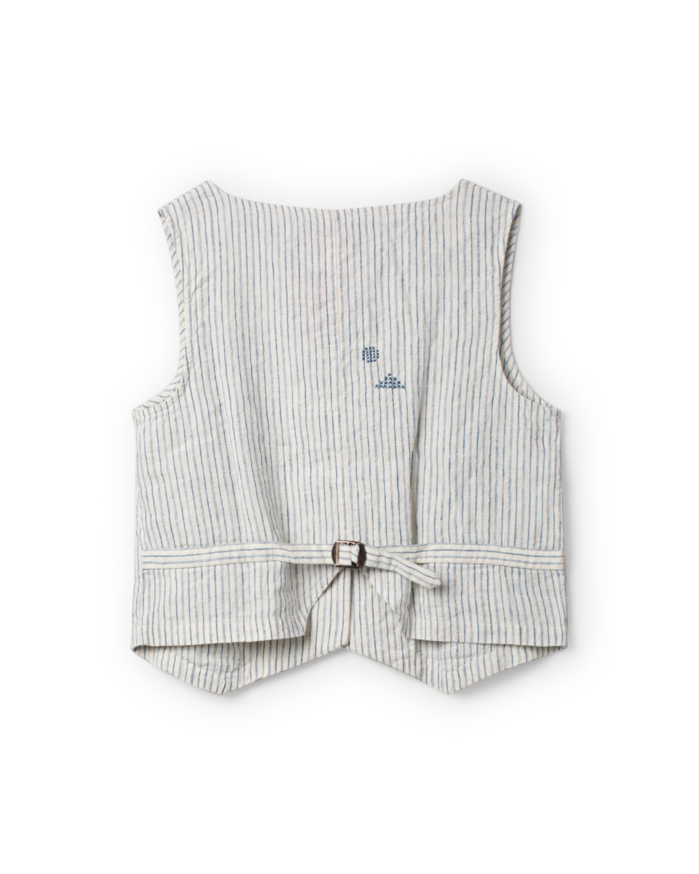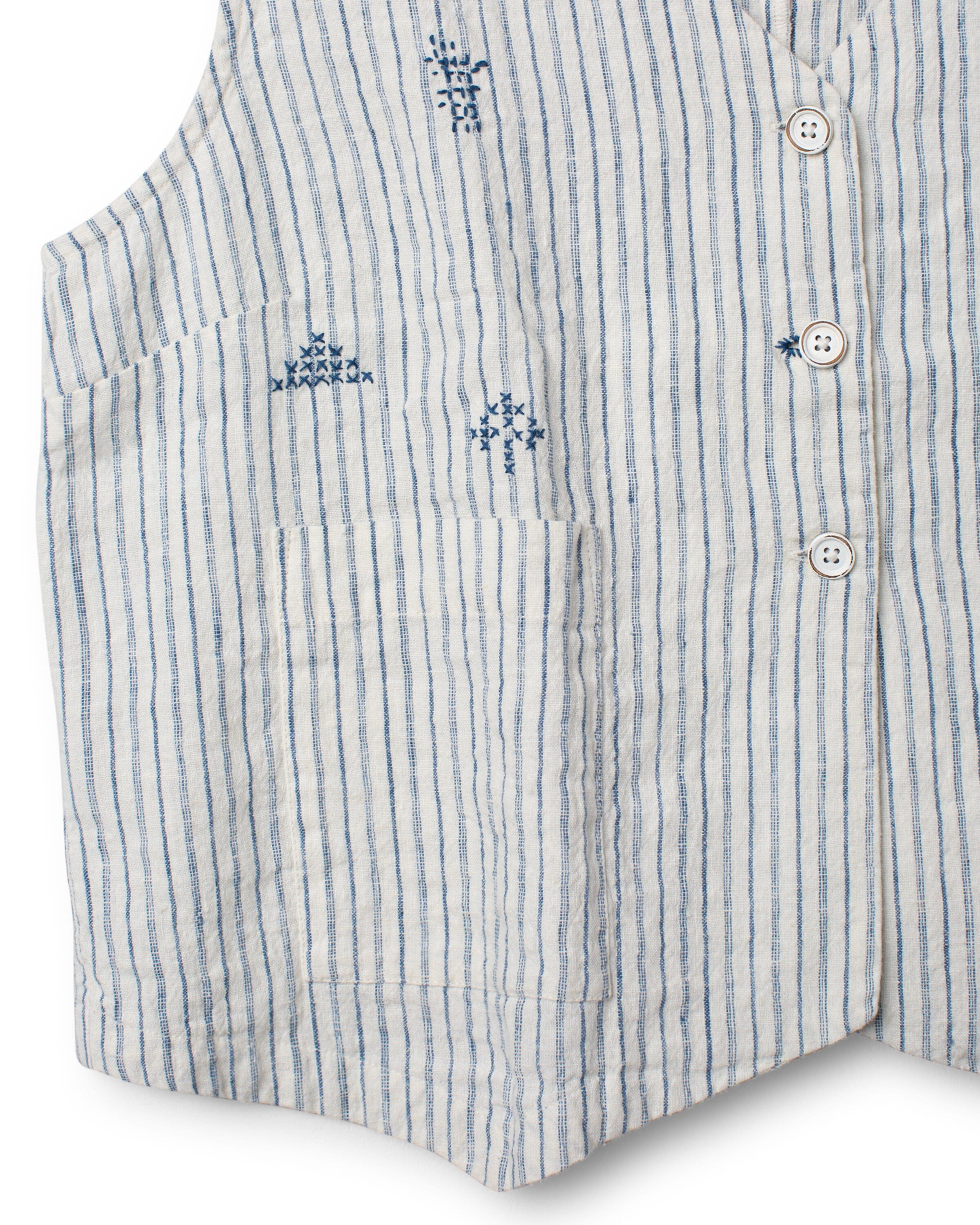 Väst i lin med vackra korsstygnsbroderier, utanpåliggande fickor och knäppning fram, justerbar slejf med västspänne bak.