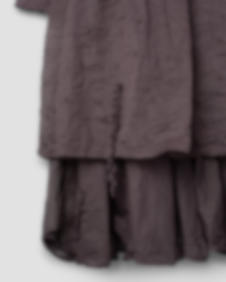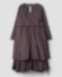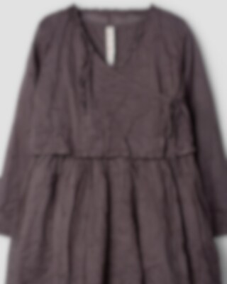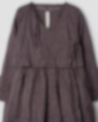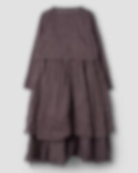 Calf-length, long-sleeved dress in embroidered sheer organdie with wrap around bodice. Skirt in double layers for lovely volume, decorated with wrinkled flounces. Note that this dress is transparent and we use a dress underneath.