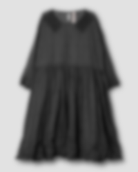 Knee-length dress in sheer embroidered organdie with collar of crocheted flowers and mother of pearl button back. Long sleeves and wrinkled skirt with endings in cotton with sewn knots. Note that this dress is transparent and we use a dress underneath.