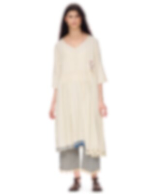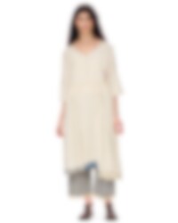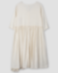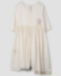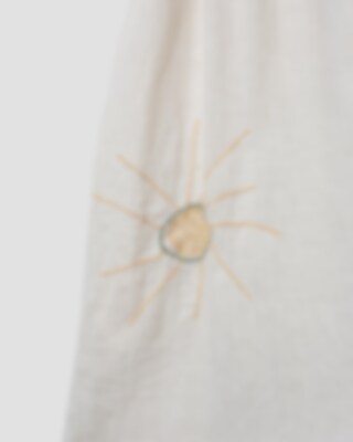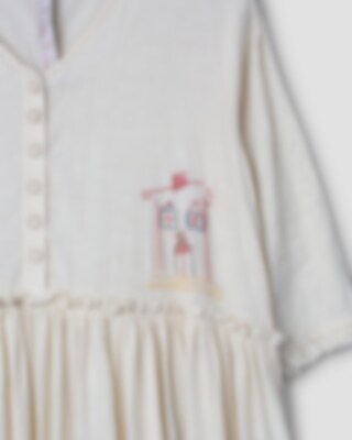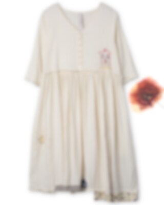 V-necked, knee-length dress in linen, three-quarter sleeves with frill and buttoning at the front. Wrinkled from the hip for lovely volume, pockets in side seams and playful embroideries.