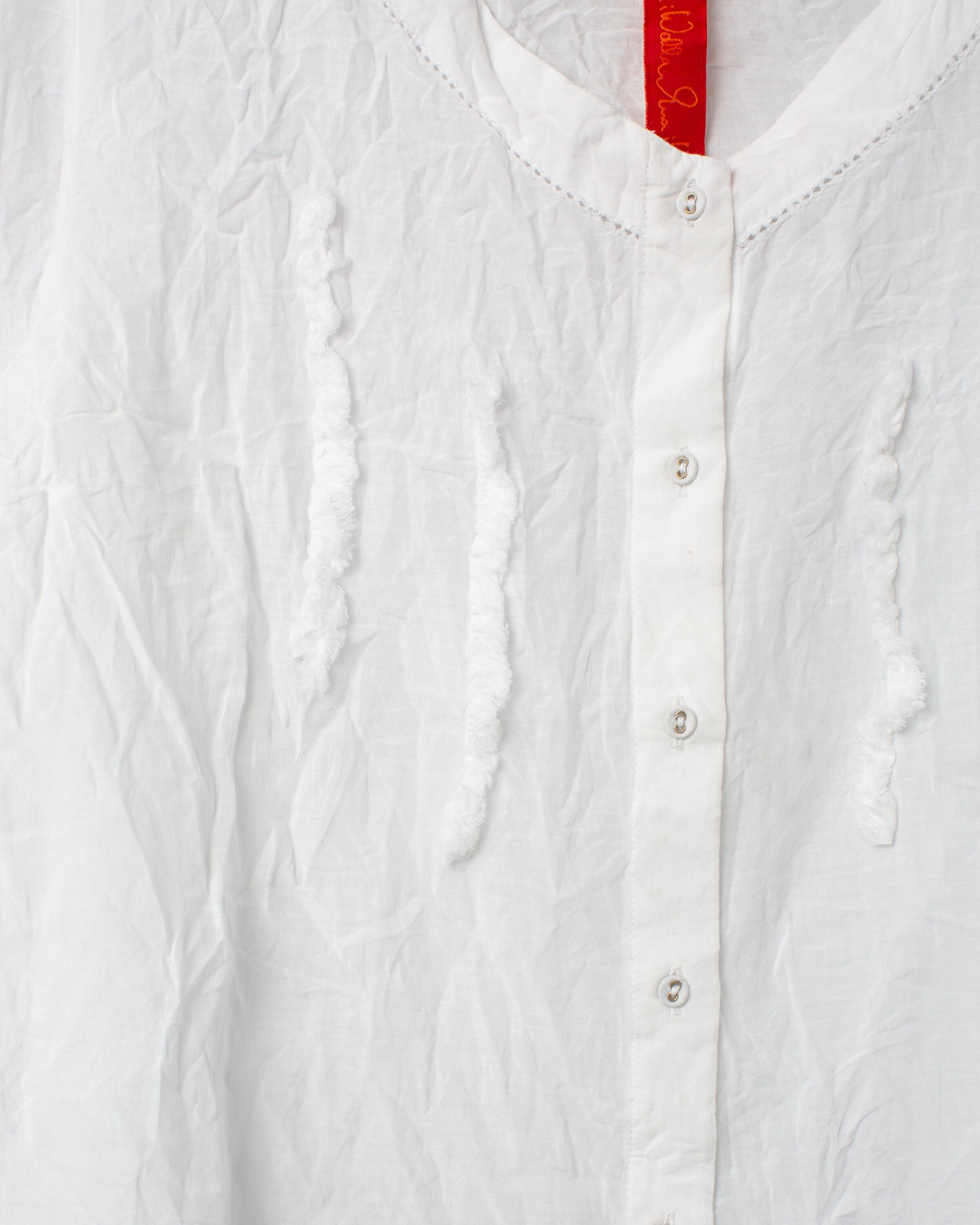 V-neck, long-sleeved blouse in sushi voile with fagoting seam at hem and around neckline, decorated with wrinkled frills and buttoned front.